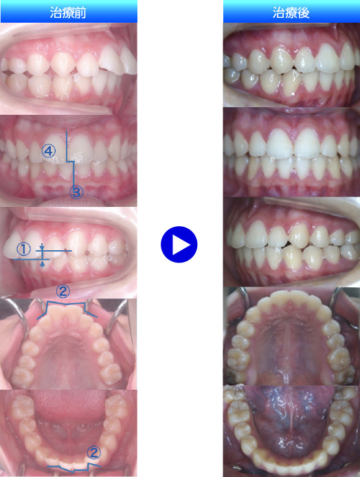 治療内容 エッジワイズ装置等を用いて、審美的改善の満足度に配慮しながら、約2年半で改善しました。