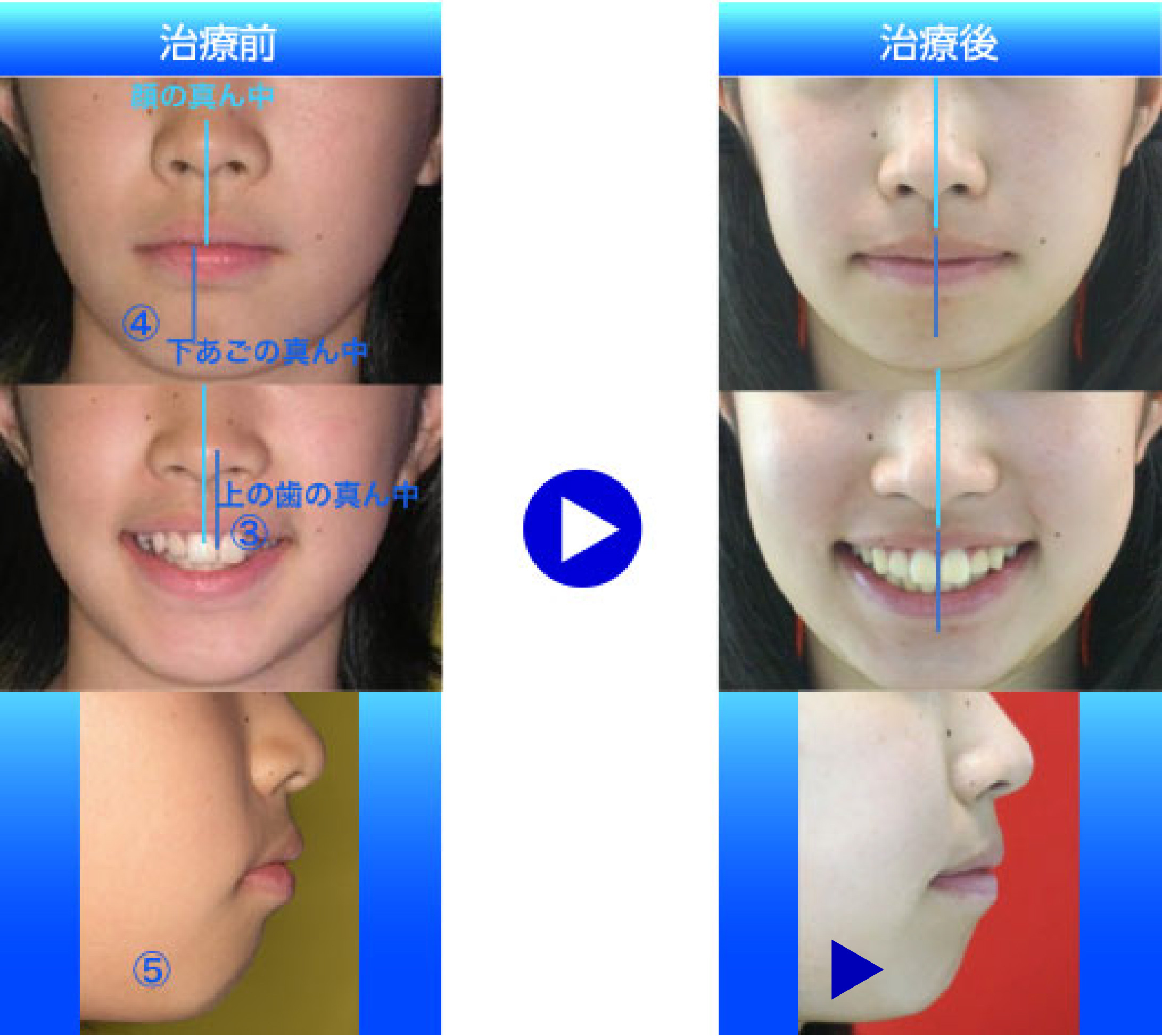 ⑤下あごが上の歯でロックされて後ろに押し込まれていることにより、咬むことがしんどく、また見た目も下あごが小さいといった感じになっている。