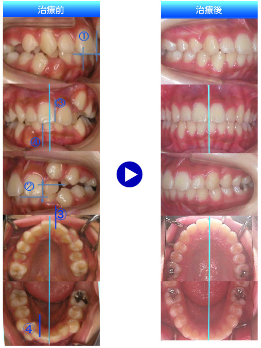 治療内容 エッジワイズ装置、リップバンパー装置等を用いて、ストリッピング 時にはエナメル質の厚み、形態に注意し、配列に際しては、歯肉の退縮も考慮して、3年半で著しいでこぼこを歯を抜かずに治しました。