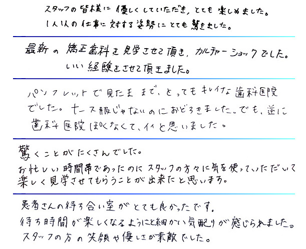 さまざまな衛生士学校の学生さん、現役の衛生士さんにも多数見学に来ていただいております。お気軽にどうぞお越しください。